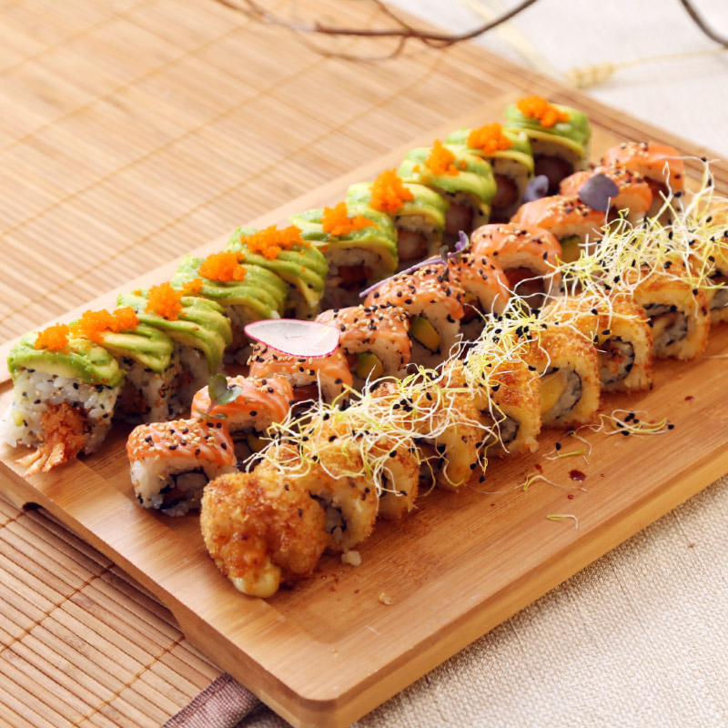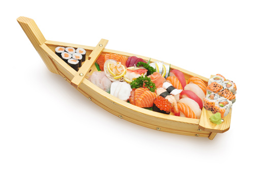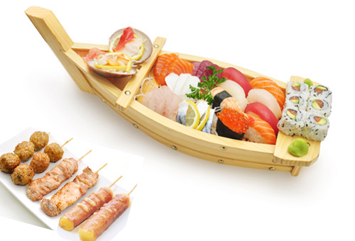 2 soupe, 2 salade, 2 riz Assortiment de 25 tranches de sashimi 10 sushi, 6 maki saumon, 6 maki las vegas