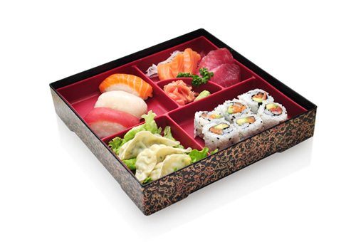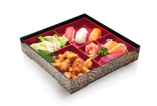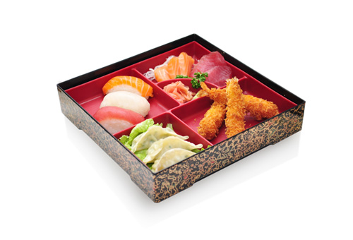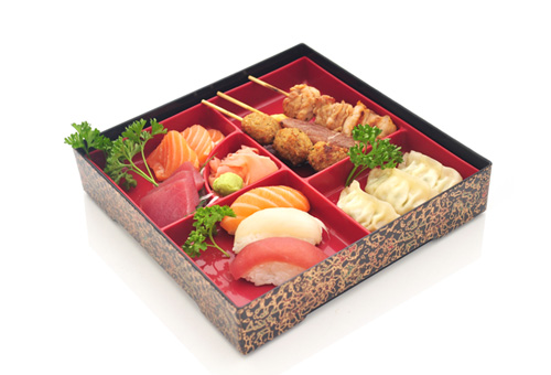 1 soupe, 1 salade, riz 3 raviolis grillés, 3 brochettes : 1 boulette de poulet, 1 poulet, 1 fromage 3 sushi, 6 sashimi