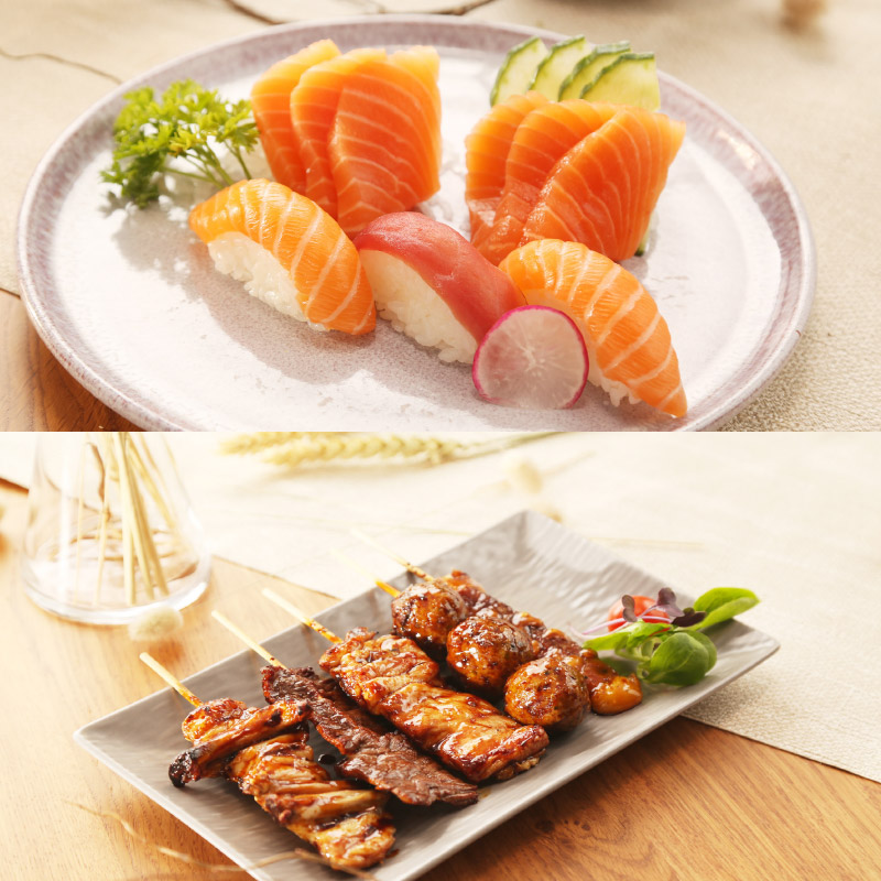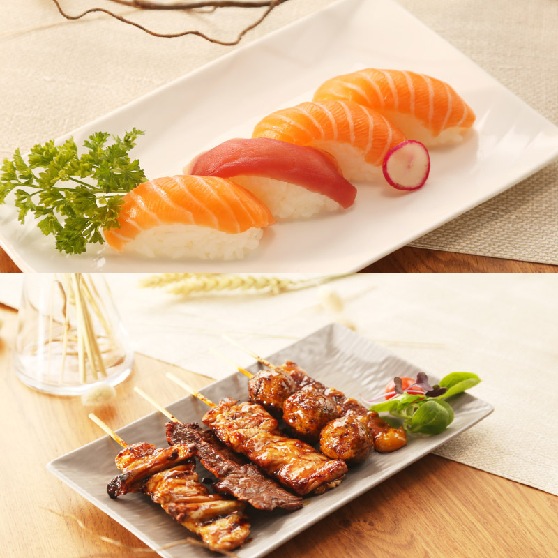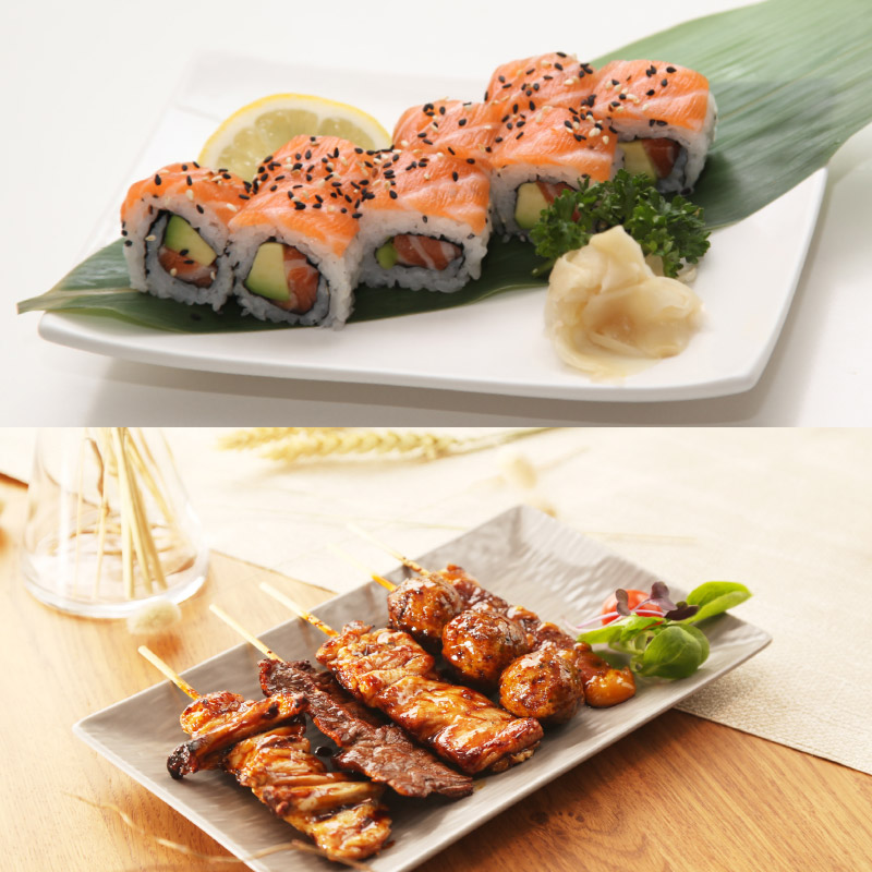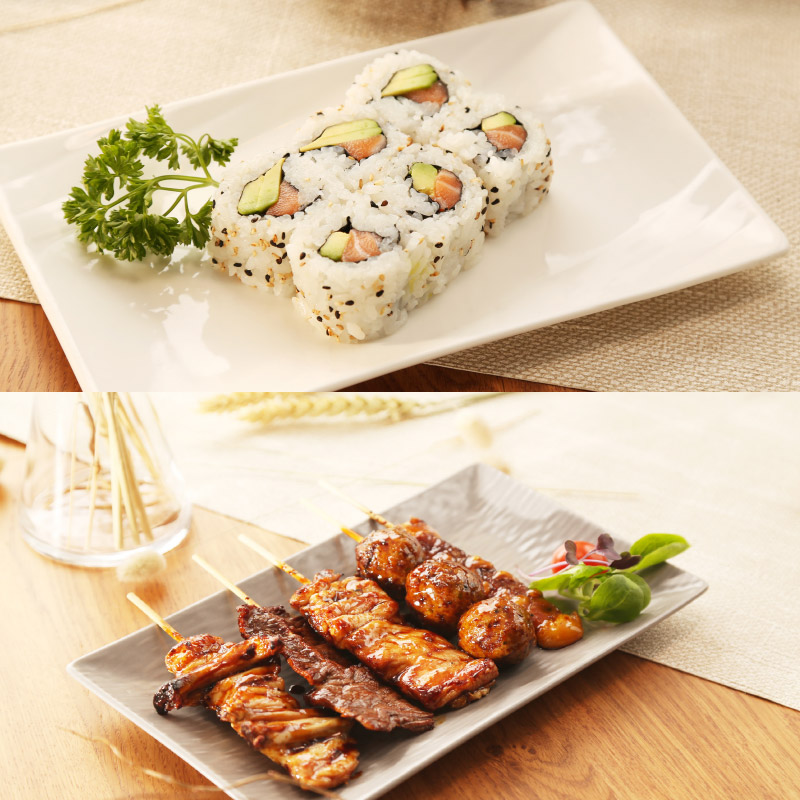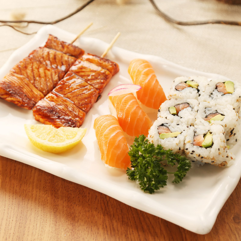 1 soupe, 1 salade, riz 3 sushi, 6 maki florida, 2 brochettes de saumon
