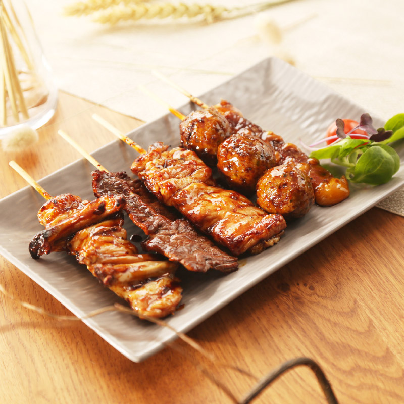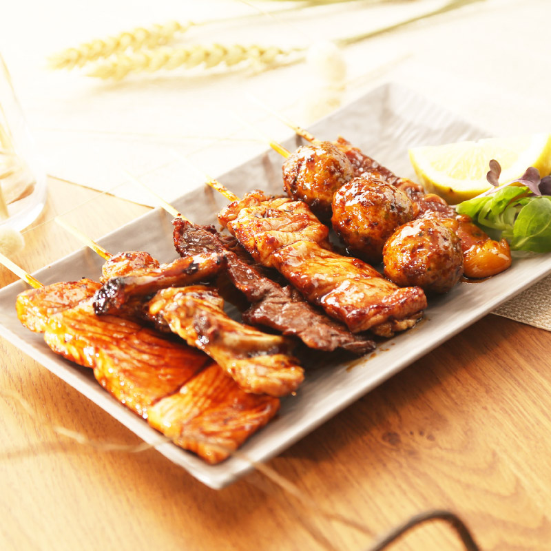 6 brochettes : 1 poulet, 1 boulette de poulet,